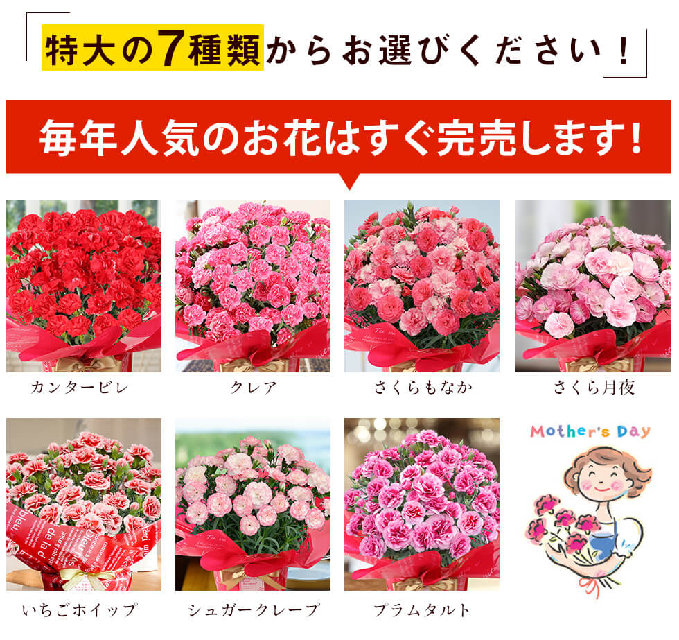 7種類の品種から色や形を選ぶことができるので、義母の好みに合わせることもできまます。